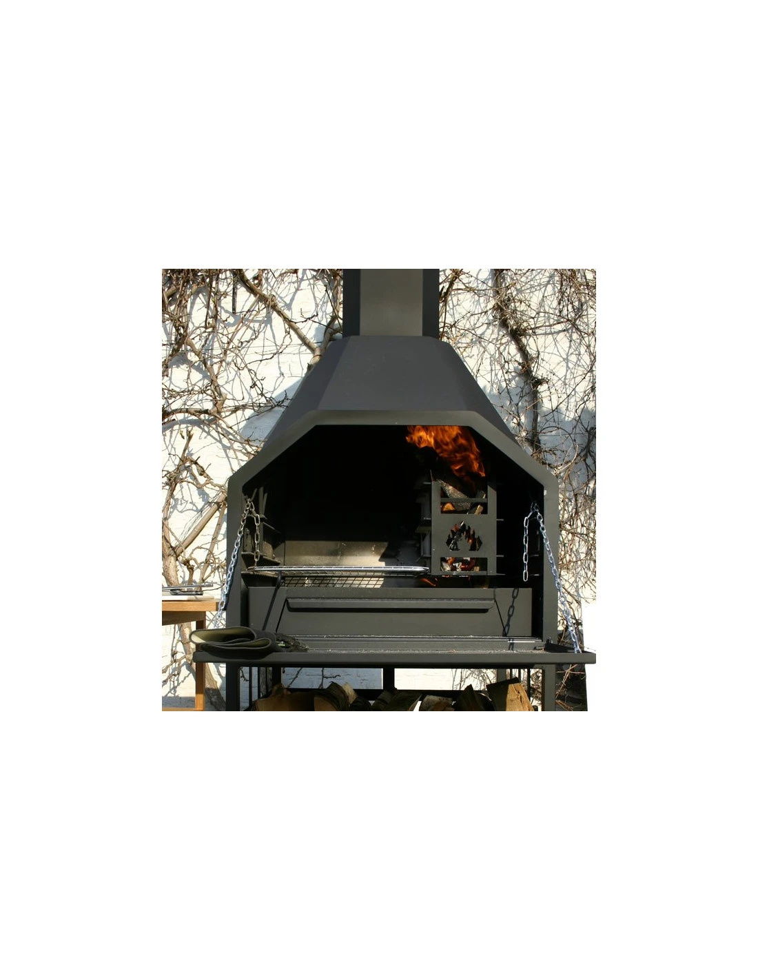 Le BRAAI FREESTANDING 800 est vendu avec une cheminée en tôle et un chapeau. Le chapeau est constitué par plusieurs éléments rectangulaires, il a comme principal fonction d’éviter l’entrée de la pluie dans la cheminée. Le Braai est fabriqué en tôle de 3 à 5mm. La hotte est déjà prémontée, vous pouvez la poser sur un support de votre choix, mais nous proposons également le socle spécifique à ce modèle qui propose un rangement pour les bûches qui est disponible sur notre site internet. A l’intérieur il faut simplement y accrocher le foyer, le tiroir, la grille et le réflecteur de chaleur. La cheminée et le chapeau sont posés sur le dessus de la hotte.