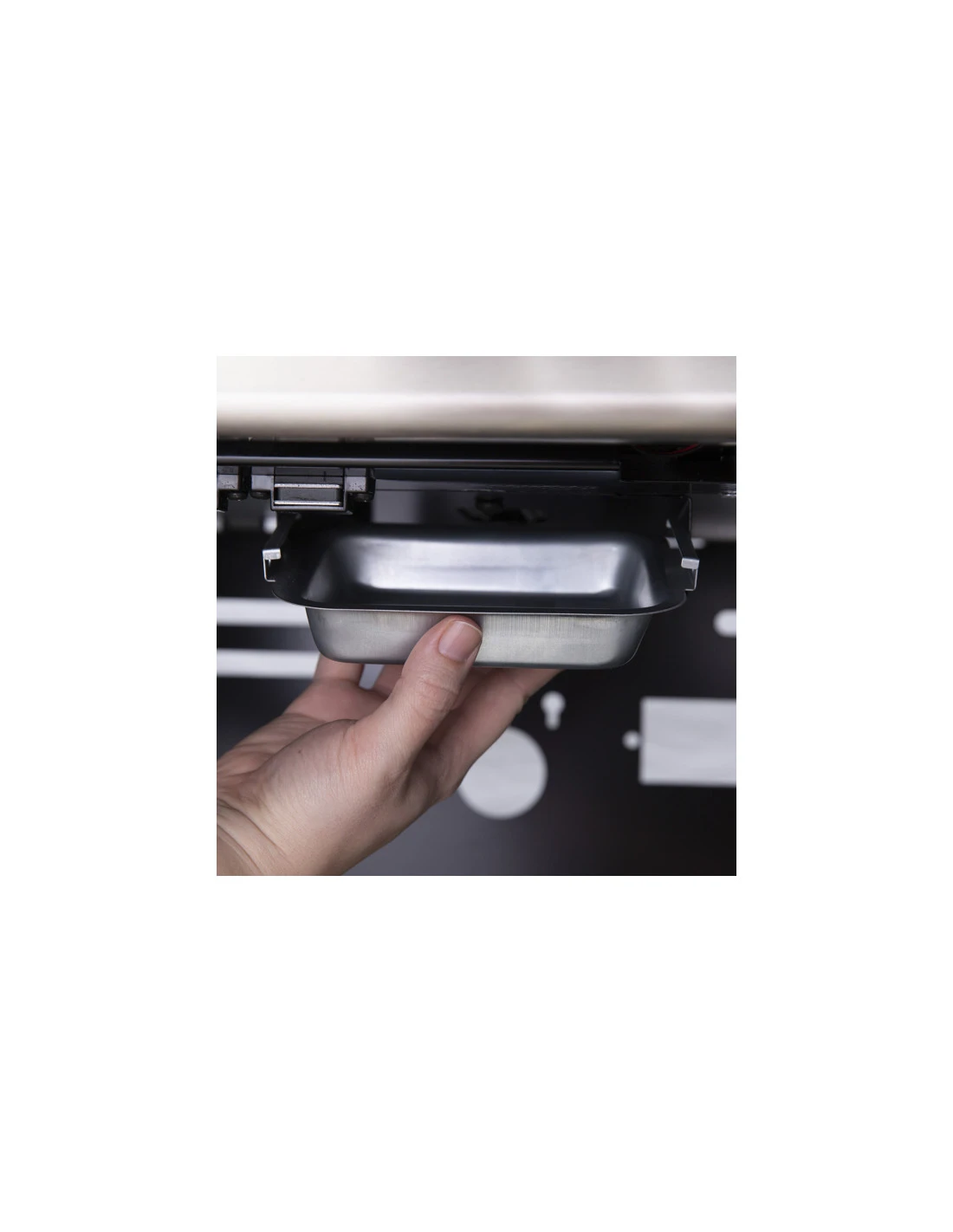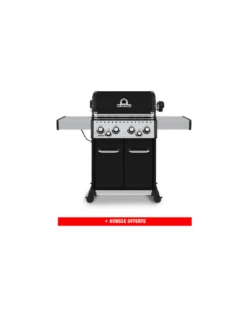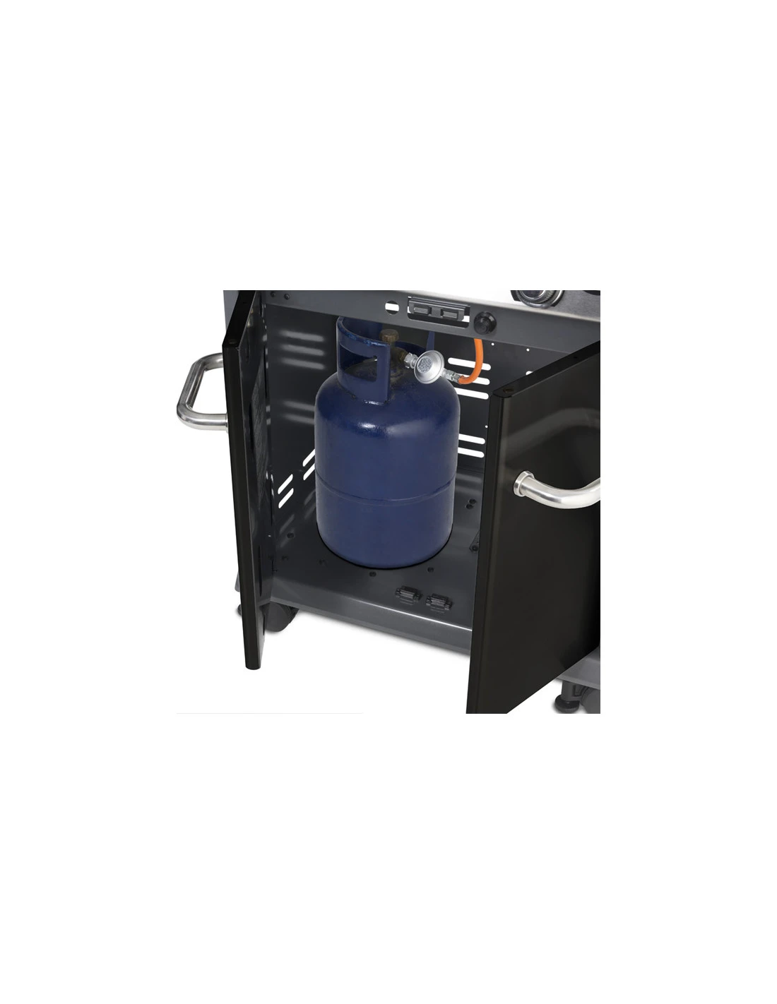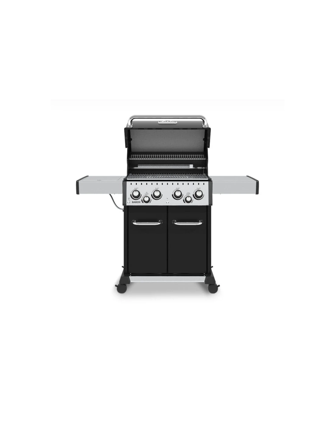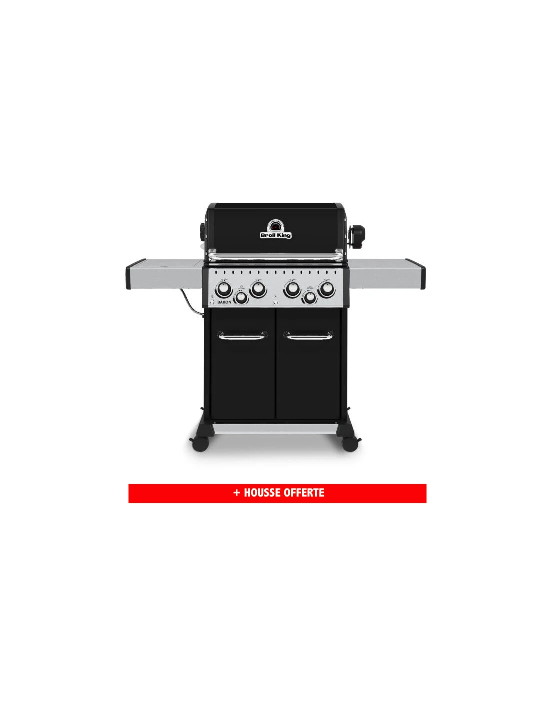 Cette version du barbecue gaz Baron 490 comporte un couvercle en acier émaillé noir, un chariot avec 2 portes en acier peint noir et des tablettes latérales en inox.