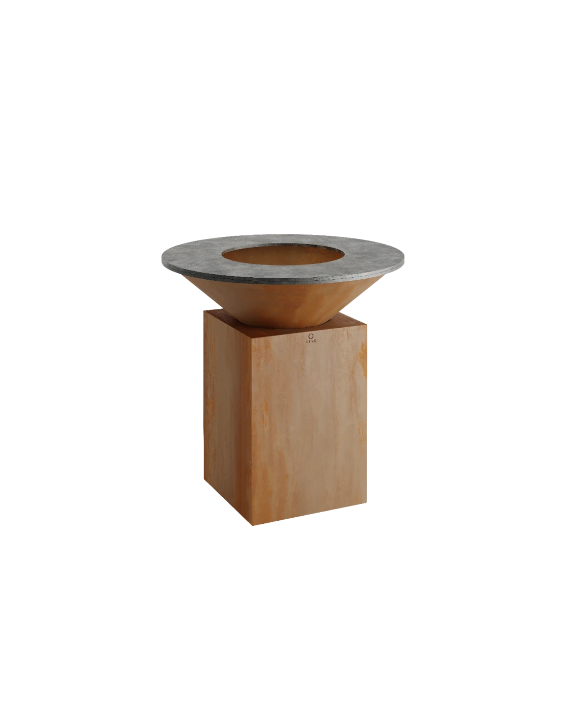 Le socle et la cuve de ce modèle sont en acier corten. La corrosion superficielle subie par l’acier permet l’obtention d’une couleur ocre profond, qui s’intègre harmonieusement dans les jardins, des plus classiques aux plus contemporains. L’acier corten résiste durablement aux conditions atmosphériques.