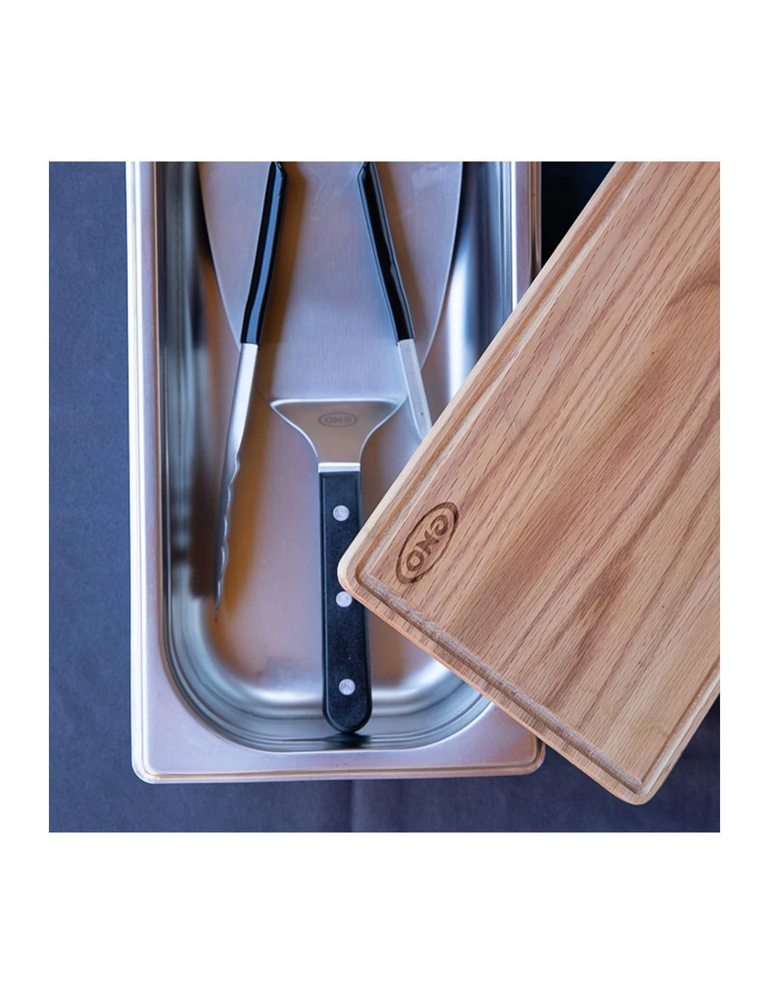 Coffret de la marque ENO composé d’un bac gastro G 1/3 inox, d’une spatule large en inox, d’une pince large en inox et d’une planche à découper en banbou. En bref, le kit parfait pour préparer et manipuler vos aliments lors de vos repas ensoleillés avec votre plancha !