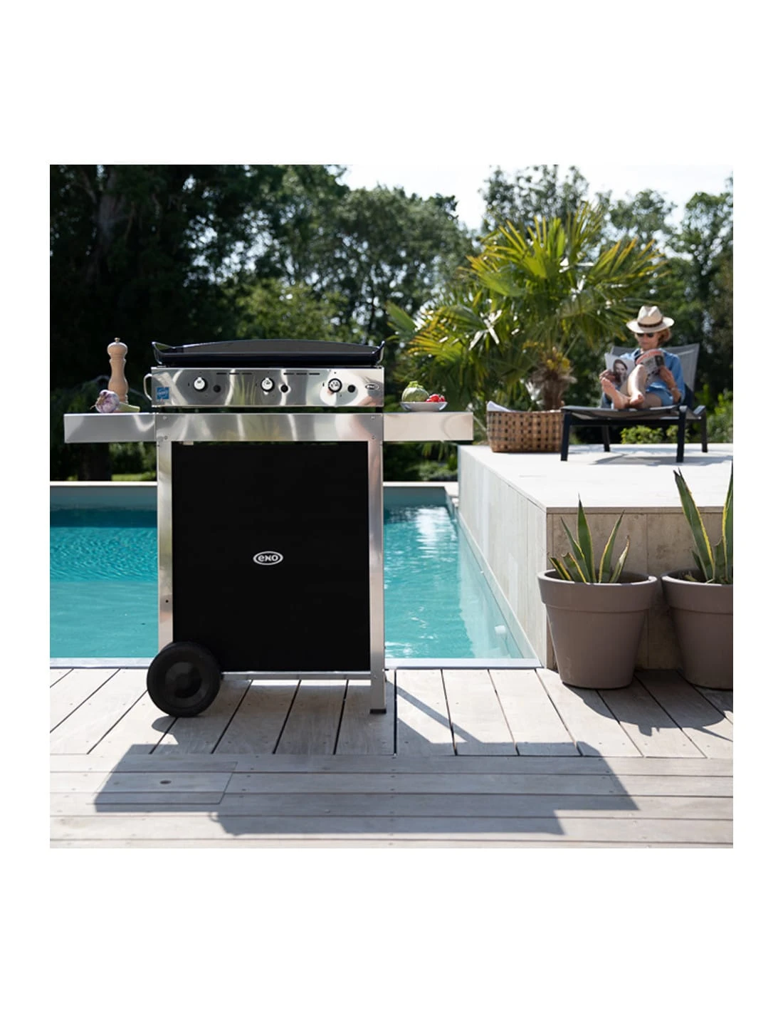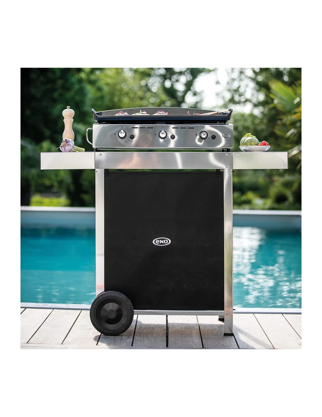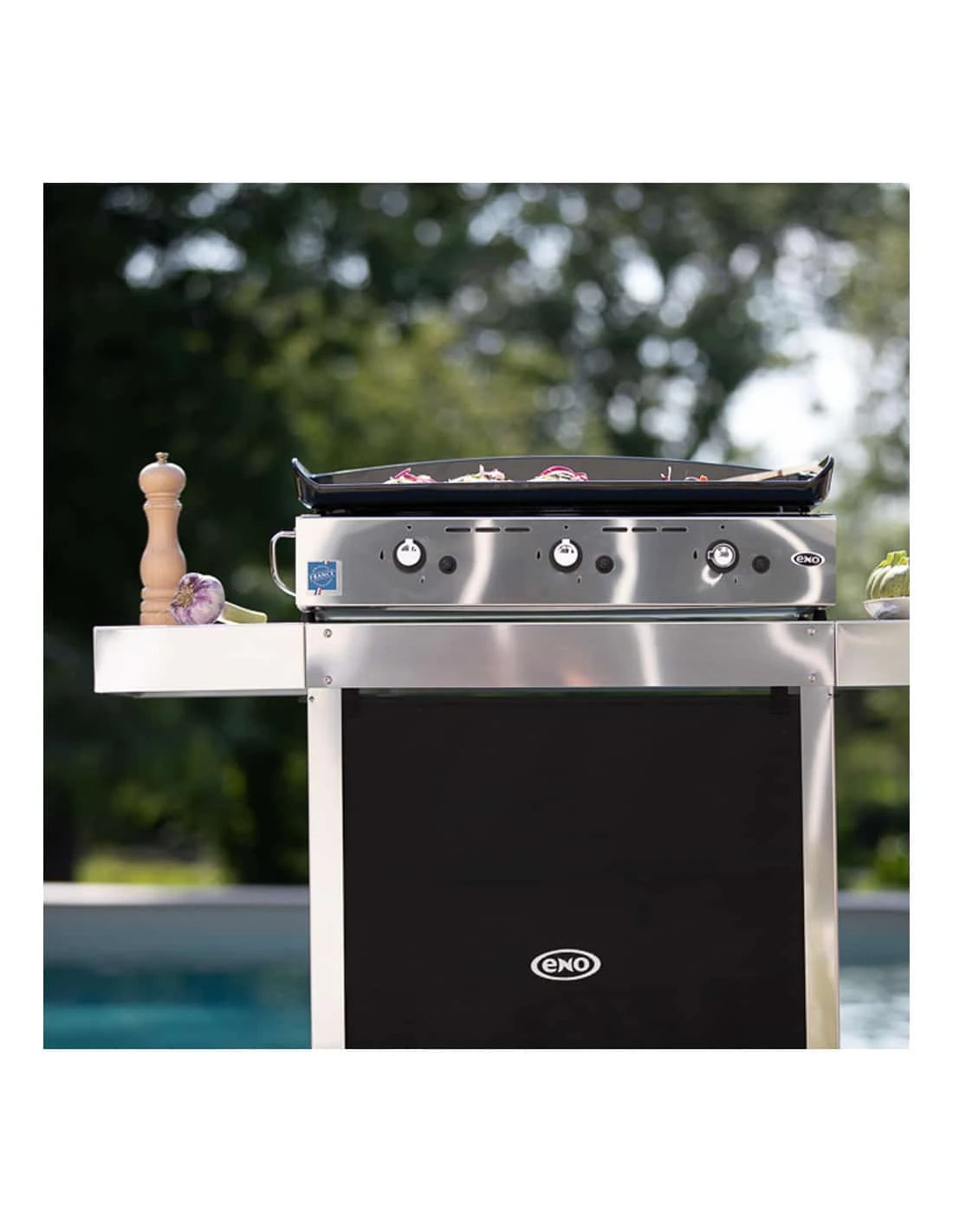 Ce modèle est le Oscar inox. Il s’agit d’une desserte en inox adaptée aux planchas de taille 45 à 80. Elle est résistante aux conditions extérieures (y compris face aux conditions hivernales) et se compose des éléments suivants :