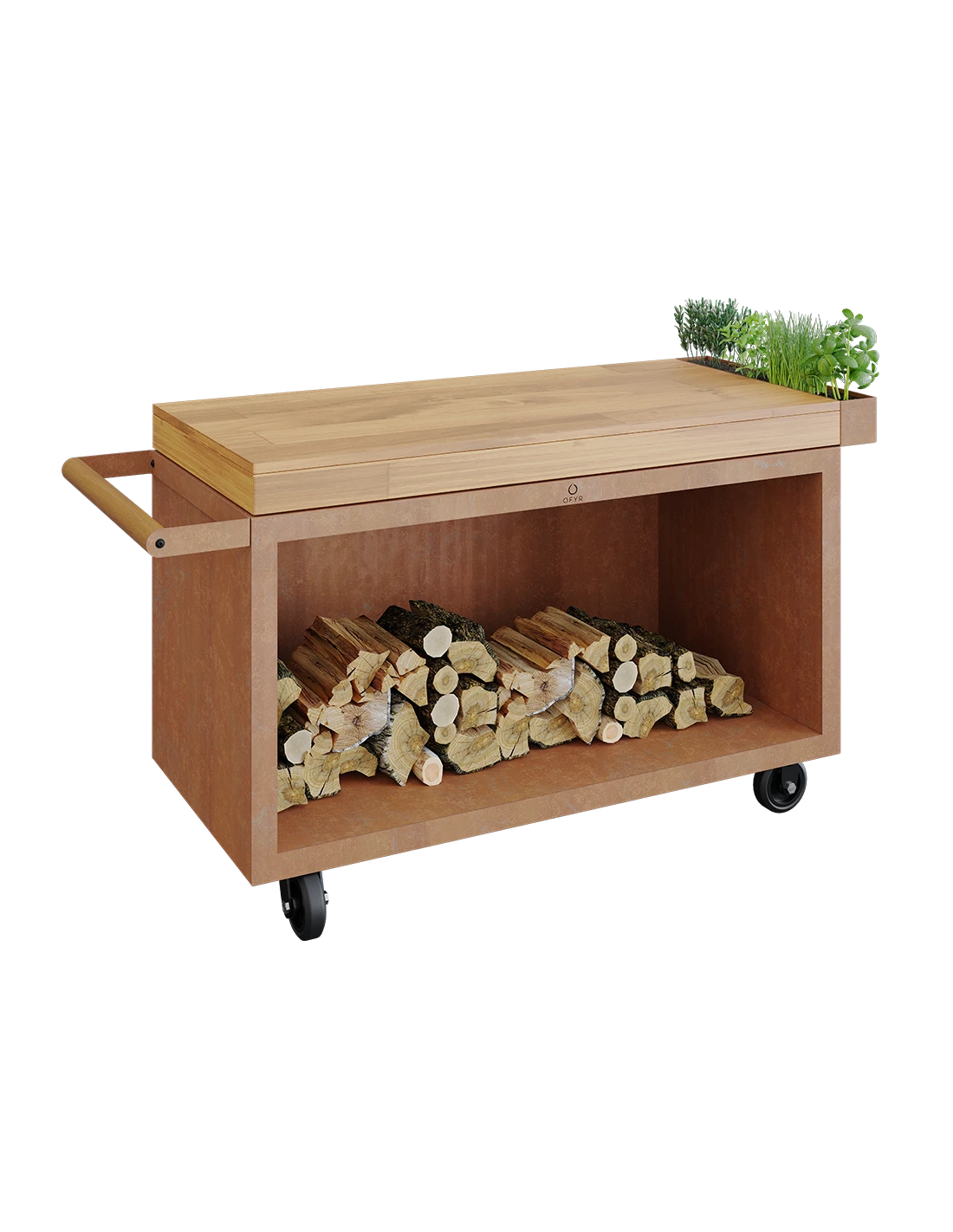 Table range bûches en acier corten et avec plateau en teck. Sur roulettes et avec poignée pour déplacer la table. Cette table complète les tables de cuisson Ofyr.