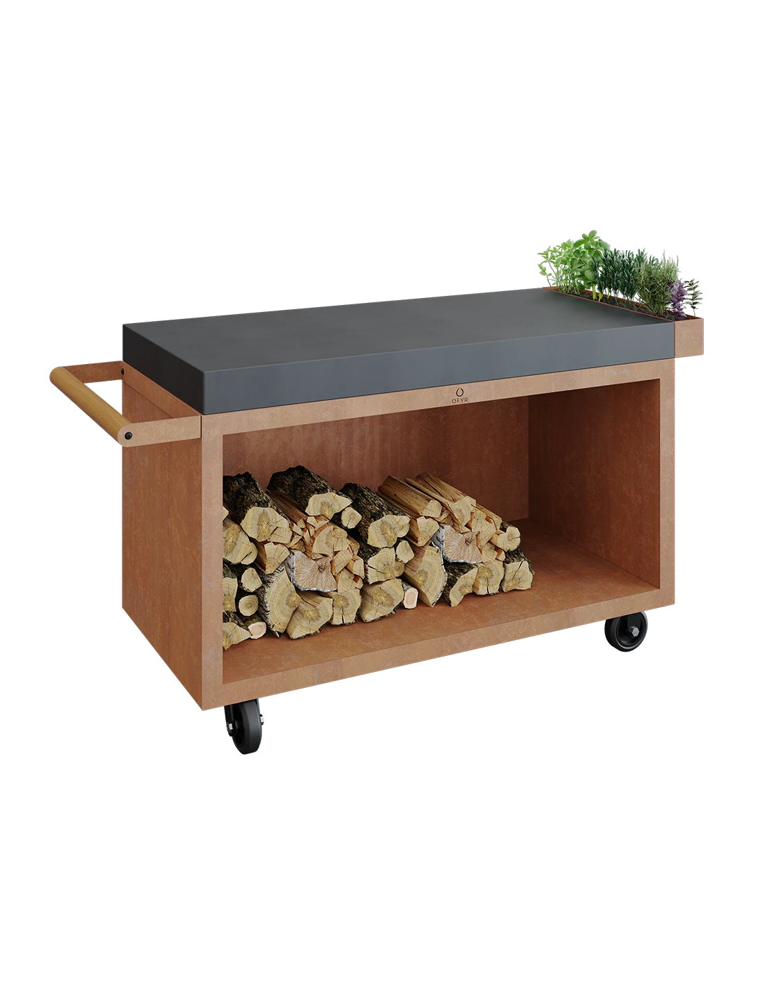 Table range bûches en acier corten et avec plateau en céramique gris anthracite. Sur roulettes et avec poignée pour déplacer la table.