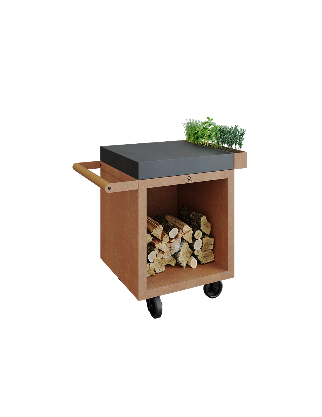 Table range bûches en acier corten et avec plateau en céramique gris anthracite. Sur roulettes et avec poignée pour déplacer la table.