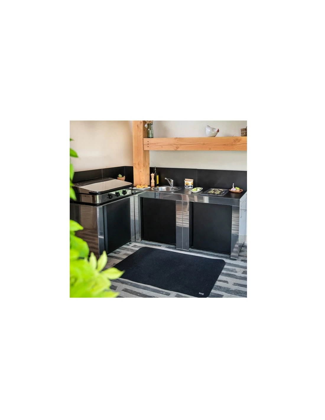 La gamme propose des modules plan de travail, évier, Plancha et un module Four et Brûleurs. Un support d’angle permet de composer une cuisine en angle. La gamme MODULO est la seule à proposer un four et des brûleurs.