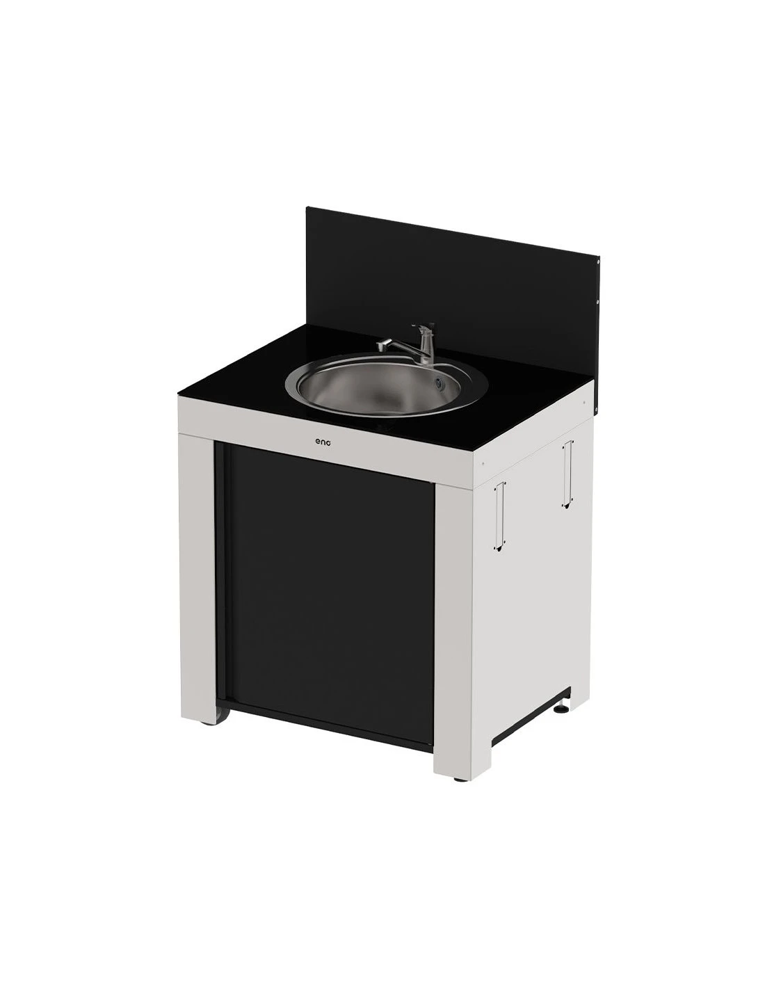 La structure est en Inox. Le plateau, la crédence et la porte sont en acier galvanisé noir. Le meuble est équipé de 2 roues pour bouger le meuble + 2 pieds réglables. L’évier est en inox avec bonde et siphon. Le mitigeur prêt à brancher.