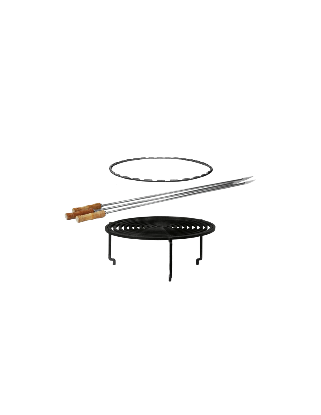 Set de 2 accessoires pour les braséros Ofyr 100 : grille de cuisson et 3 brochettes brésiliennes (churrasco) avec support.